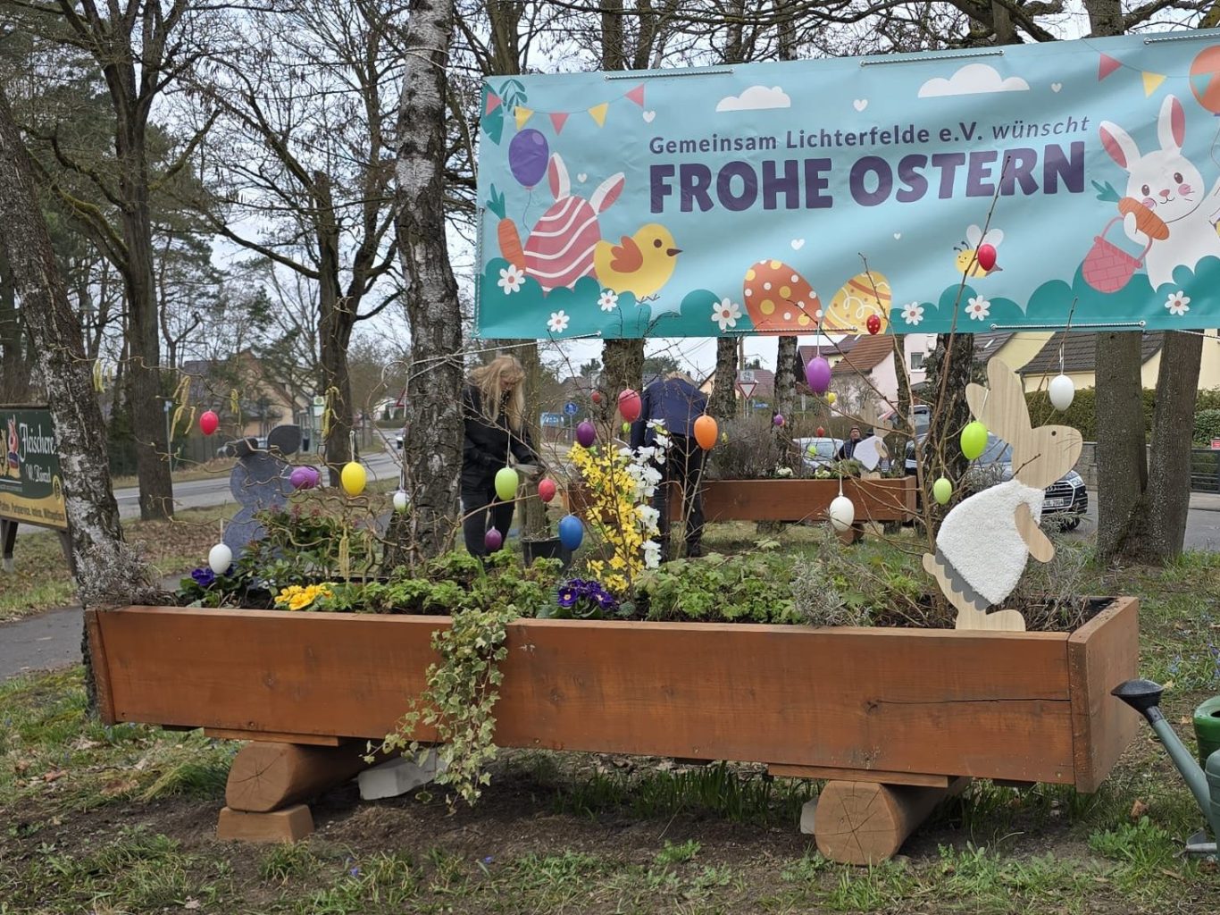 Pünktlich vor Ostern wurden die Blumenkästen am Ortseingang österlich geschmückt. Viele bunte Ostereier, fröhliche Osterhasen aus Holz und Stoff sowie einige neue Frühlingsblüher sorgen für gute Laune.