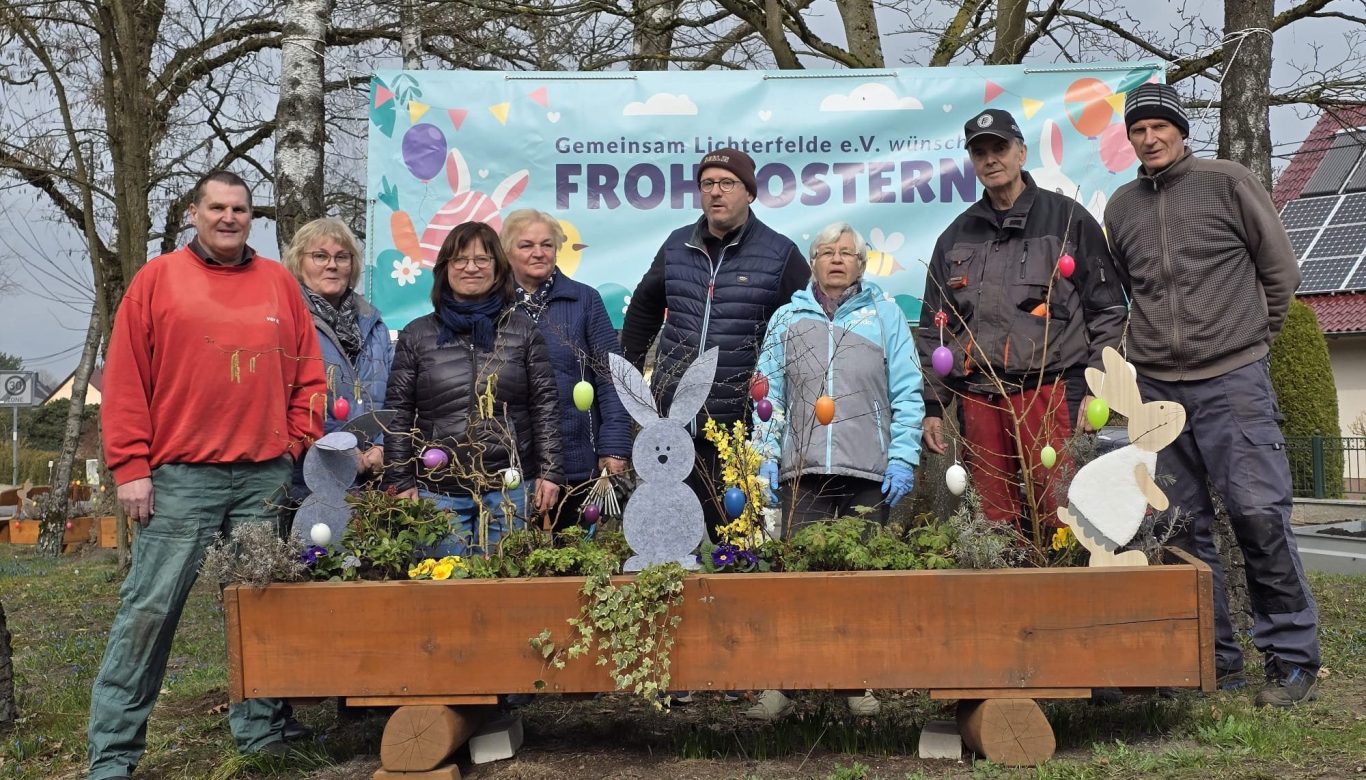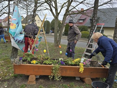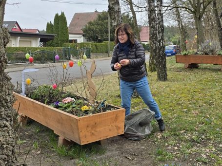 Pünktlich vor Ostern wurden die Blumenkästen am Ortseingang österlich geschmückt. Viele bunte Ostereier, fröhliche Osterhasen aus Holz und Stoff sowie einige neue Frühlingsblüher sorgen für gute Laune.